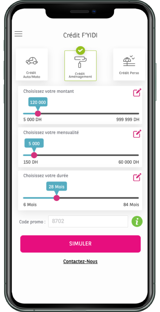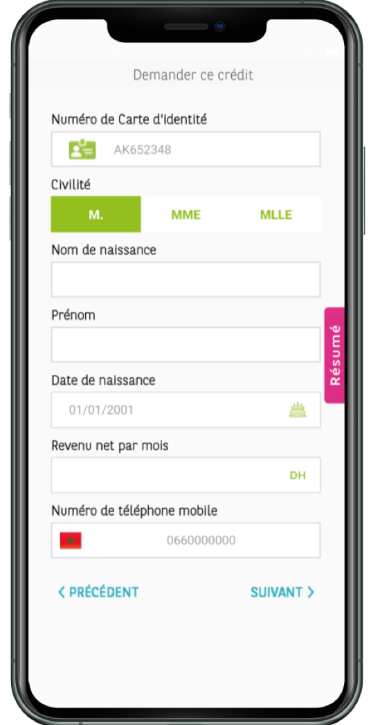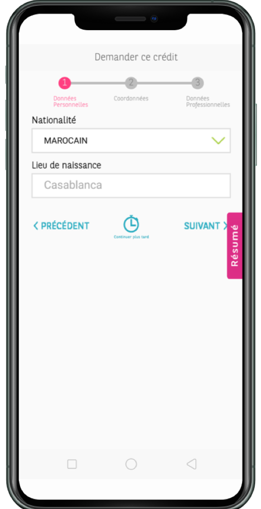 اكتشفوا خاصيات تطبيق "كريدي فيدي" بالصور التالية. يمكنكم التطبيق من الحصول على موافقة مبدئية عبر الأنترنت في غضون بضع نقرات.